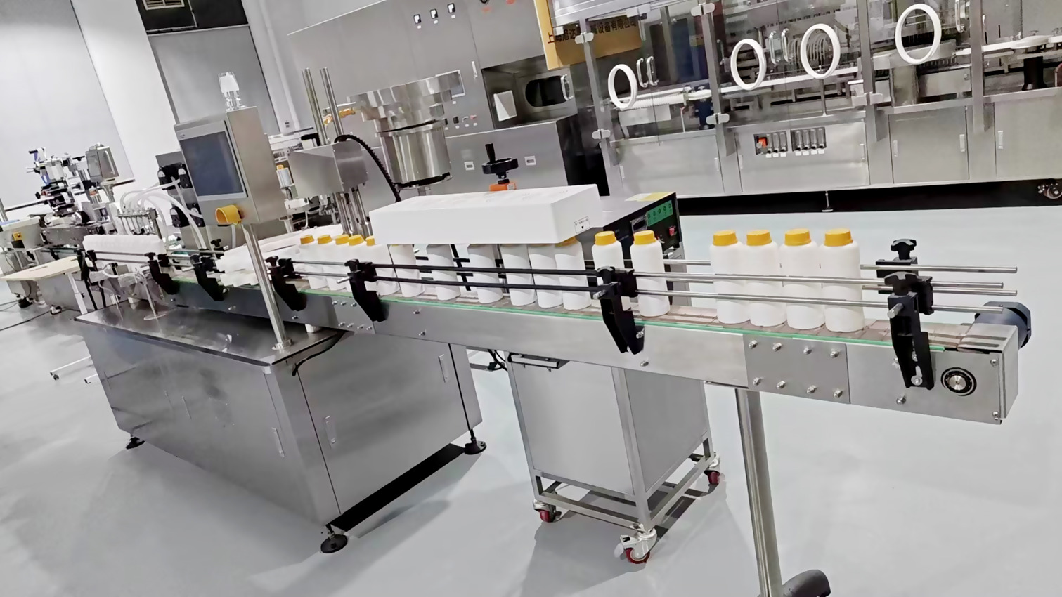 制藥行業罐裝旋蓋整套生產線配套應用